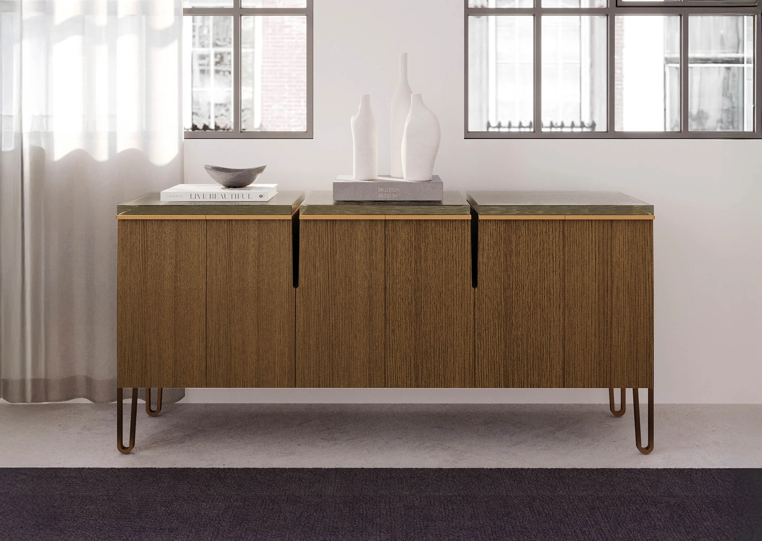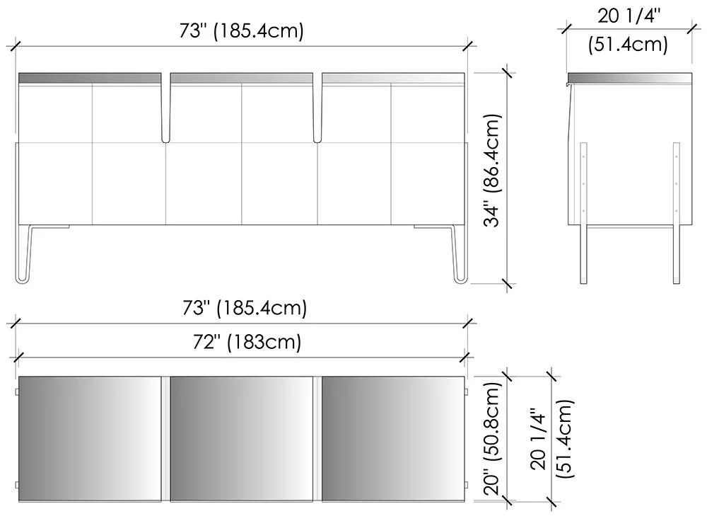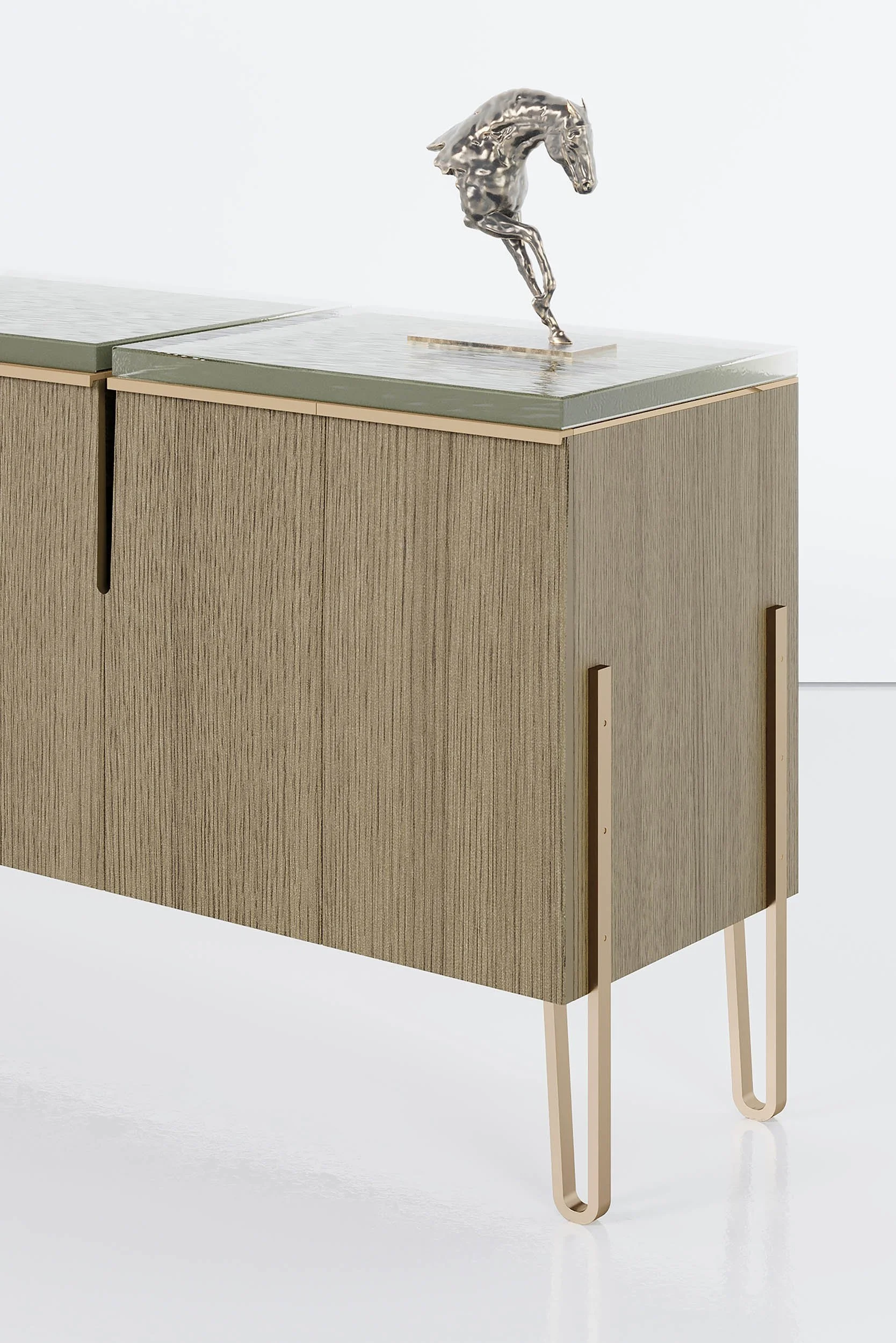 THE BALLENA CABINET IS SUPPORTED ON ELLIPTICAL LEGS: ITS COMPONENTS SUBTLY PULLING AWAY FROM EACH OTHER TO CREATE THREE DISCRETE STORAGE UNITS. THE ADDITION OF MASSIVELY THICK, SILVERED, QUARTZ CROWN GLASS ACCENTUATES THE TRIPARTITE DESIGN, AND MAKES THIS A TRULY SINGULAR PIECE.