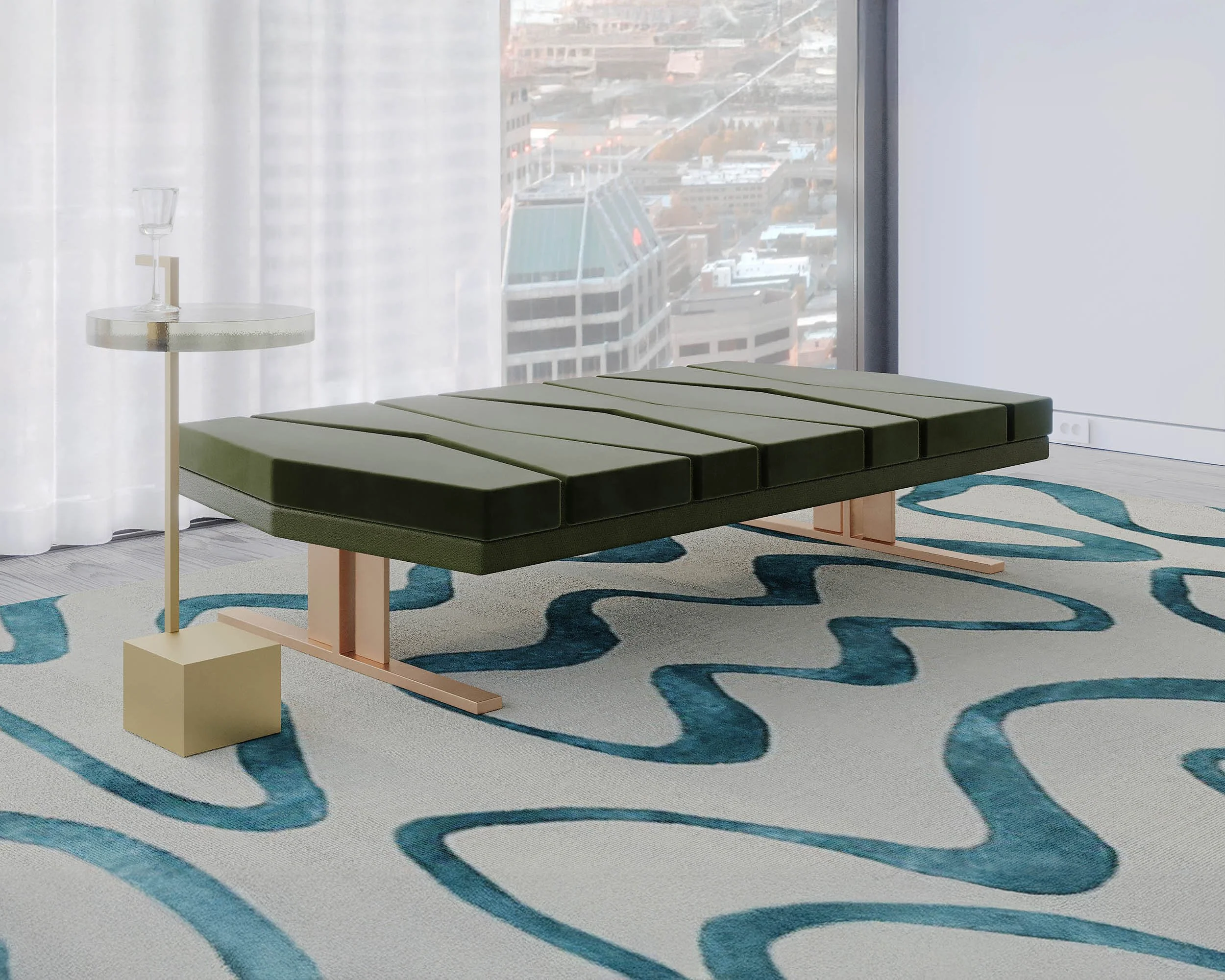 THE MARIGOT CHAISE LONGUE FEATURES A BOLDLY GRAPHIC PATTERN OF ALTERNATING HEXAGONAL AND HOURGLASS SHAPES WHICH INVITE THE USER TO LAY LUXURIOUSLY. UTILIZING THE NEWEST UPHOLSTERY TECHNOLOGY AVAILABLE, CUSHIONS EMERGE OUT OF A LEATHER GRID, REINVENTING THE LANGUAGE OF TUFTING.