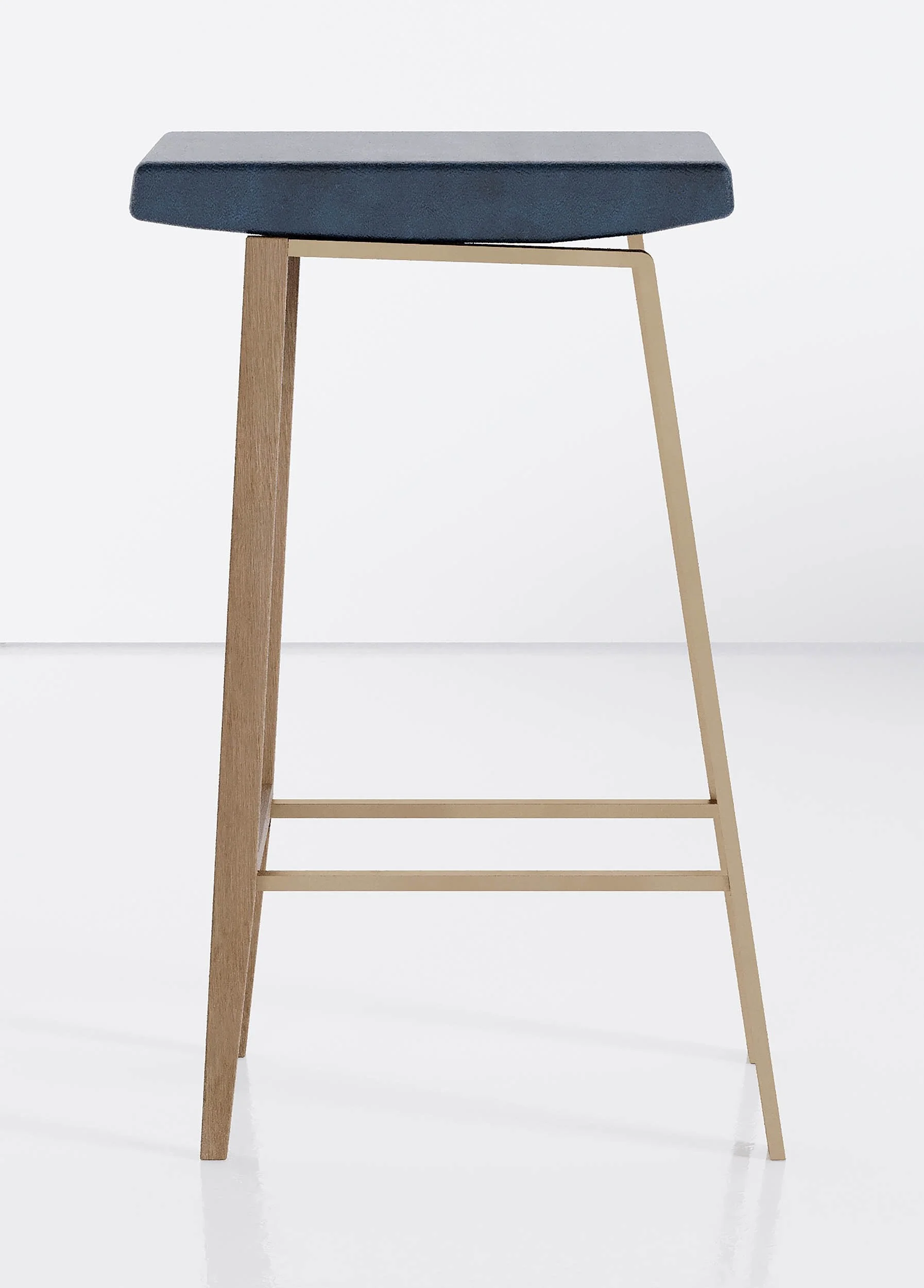GREY OAK FRONT LEGS. BRASS REAR LEGS AND SUPPORT. INK LEATHER SEAT.
