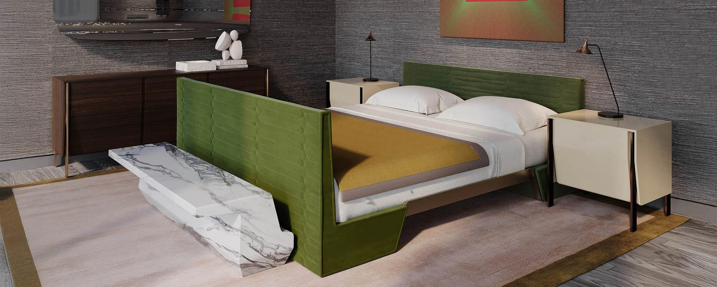 BEDROOM BEDROOM BALLENA SIDE CABINET with GLASS TOP BALLENA SIDE CABINET with STONE TOP CÁDIZ BED CÁDIZ BED with LOWER FOOTBOARD FORTUNA SIDE CABINET KOMODO SIDE CABINET PARAISO SIDE CABINET