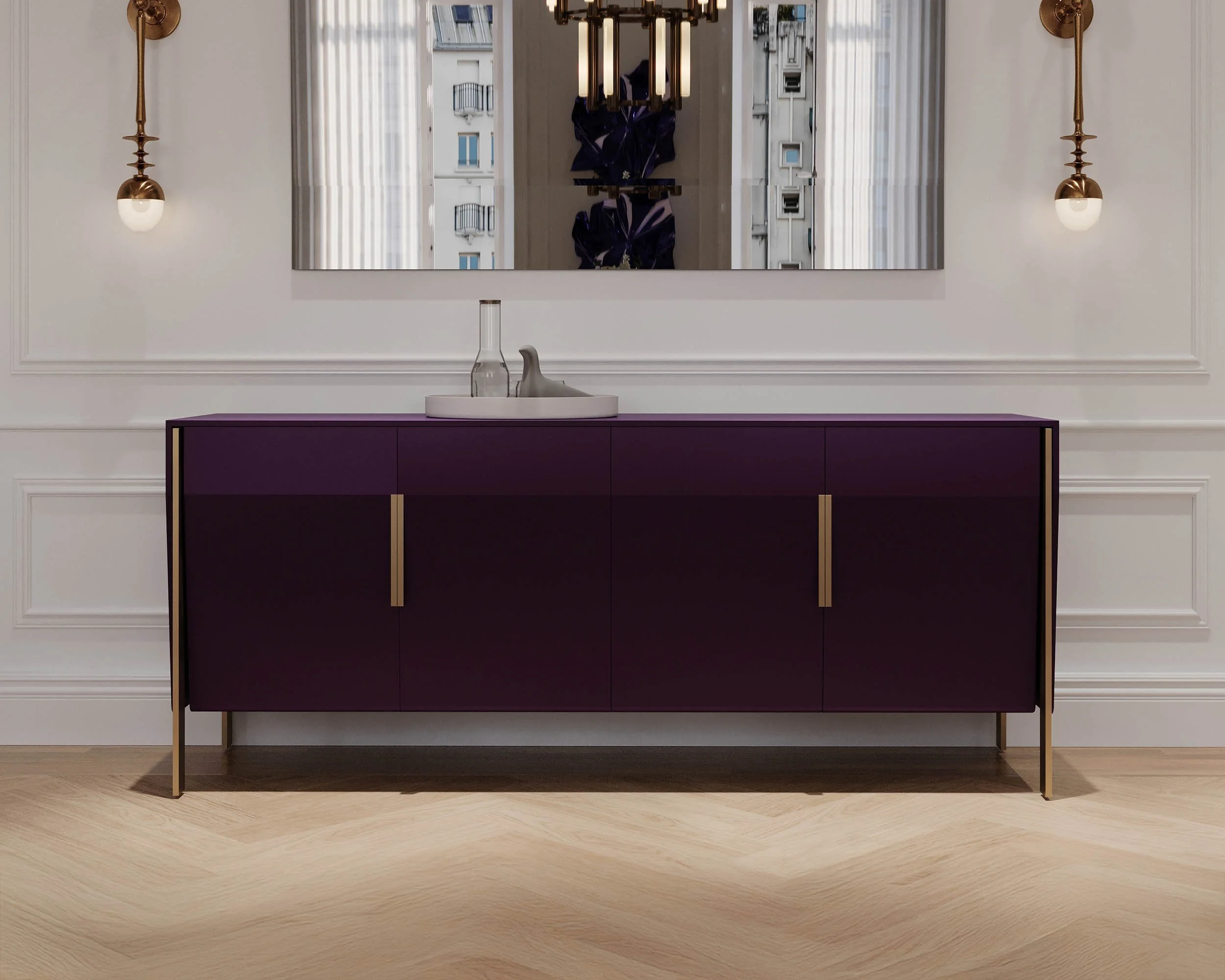 THE FORTUNA SIDEBOARD GIVES THE ILLUSION OF BEING PRECARIOUSLY SUSPENDED FROM ITS METAL ARMATURE, WHICH REVEALS ITSELF AS THE CABINET DESCENDS. METAL BARS EMERGE FROM THE CABINET’S FACE TO BECOME DOOR PULLS.