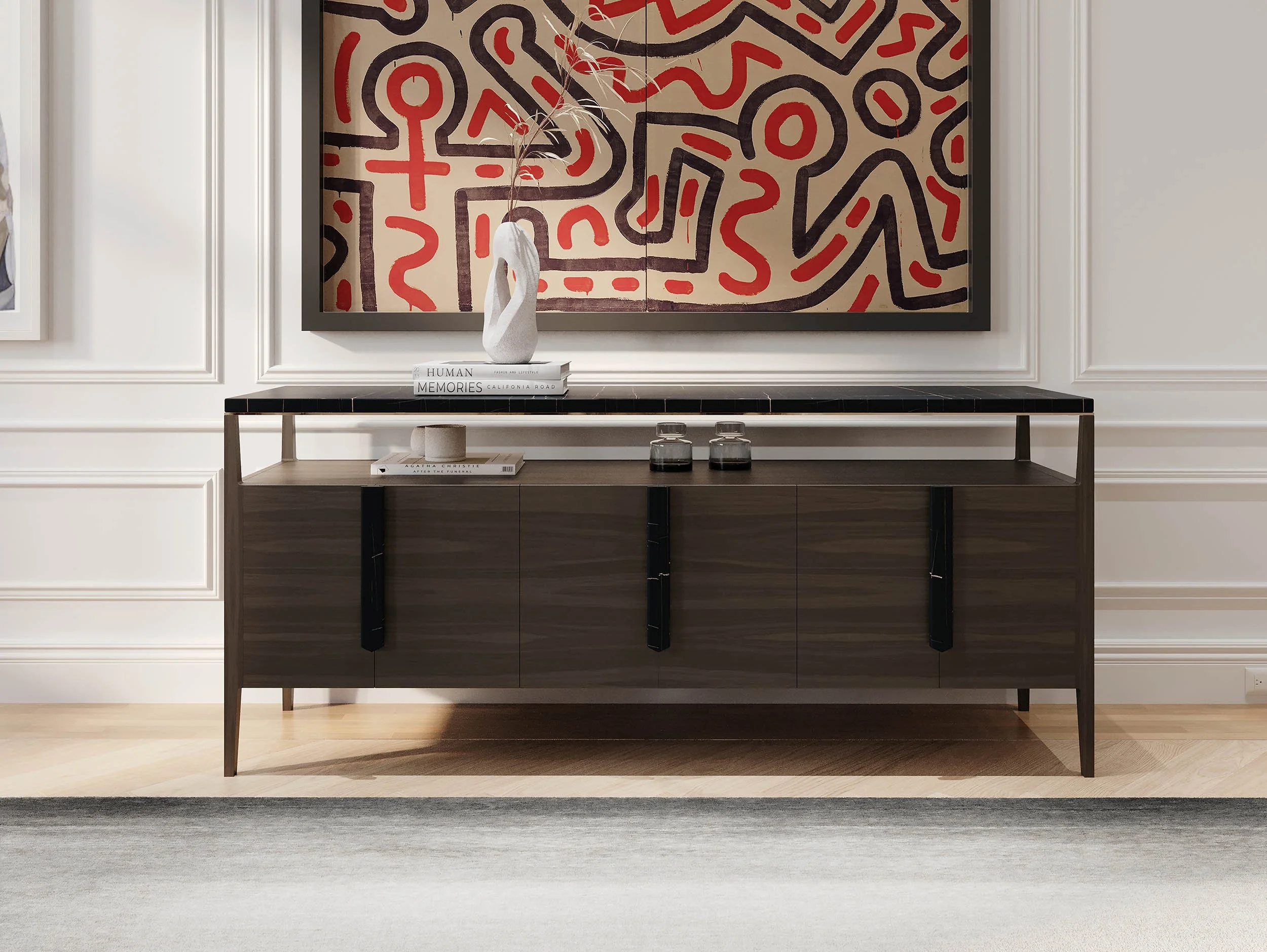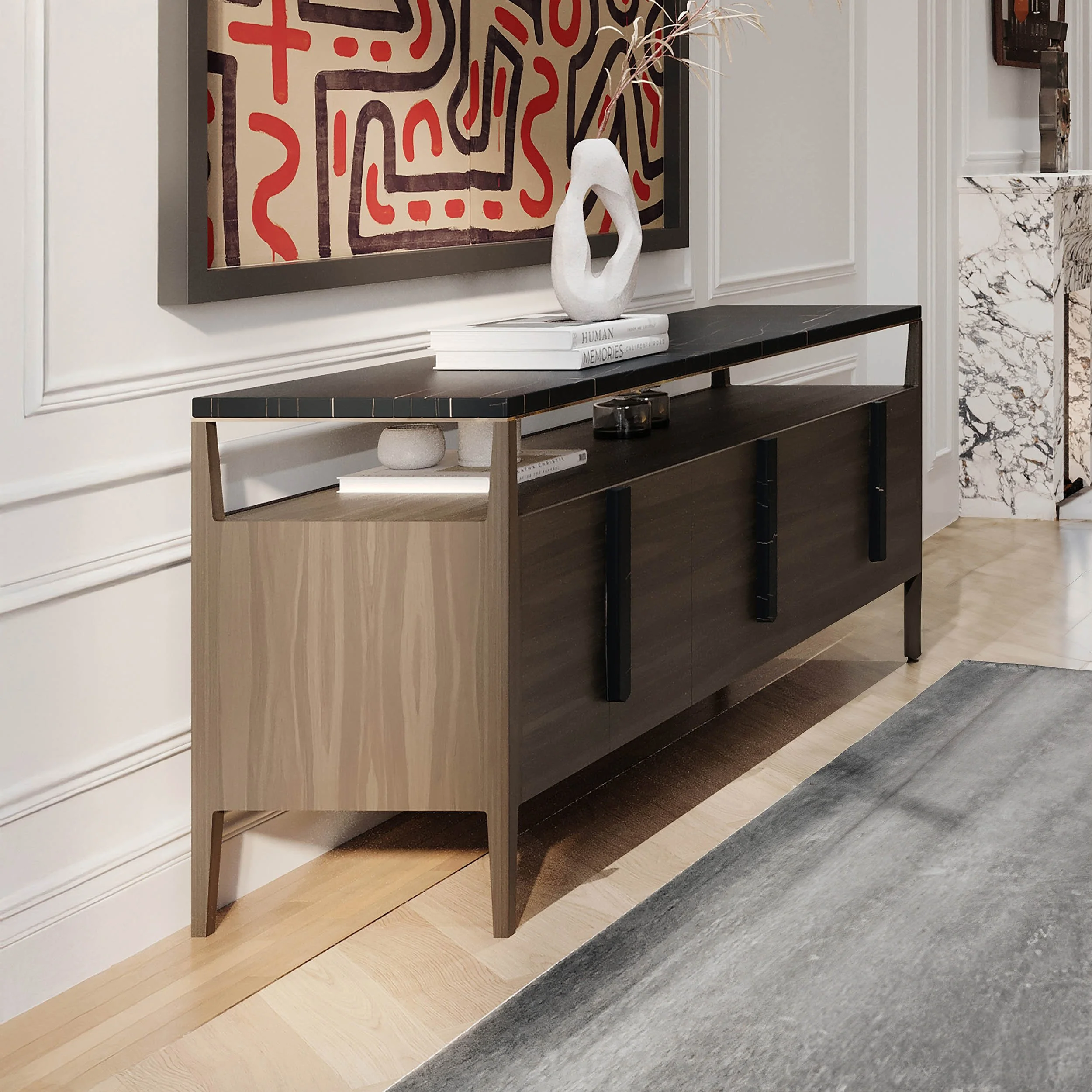 IT SEEMED LIKE A REALLY GOOD IDEA TO MAKE THE TOP OF THE KOMODO SIDEBOARD STONE, SINCE WE WANTED IT TO BE A TRULY FUNCTIONAL PIECE: SOMETHING YOU COULD SET A HOT PLATTER ON OR SPILL A COCKTAIL SHAKER AND NOT HAVE TO WORRY. BUT WE ALSO WANTED TO TAKE THE INNATE SENSUOUSNESS OF MARBLE A STEP FURTHER AND MAKE IT MORE EXPERIENTIAL. WHY NOT CARVED MARBLE HANDLES, SOFTLY ROUNDED SO THEY FEEL SINUOUS WHEN YOU’RE REACHING FOR THAT COMPOTE BOWL? JUST AS IMPORTANTLY, CARRYING THE MARBLE DOWN THE FRONT GIVES THE KOMODO A UNITY OF FORM AND MAKES THIS PIECE TRULY SPECIAL. AND WE NEED TO MENTION THE OPEN AREA UNDER THE TOP, A PERFECT STAGING AREA, OR MAYBE JUST A COOL PLACE TO SHOW OFF A GREAT DECORATIVE OBJECT.