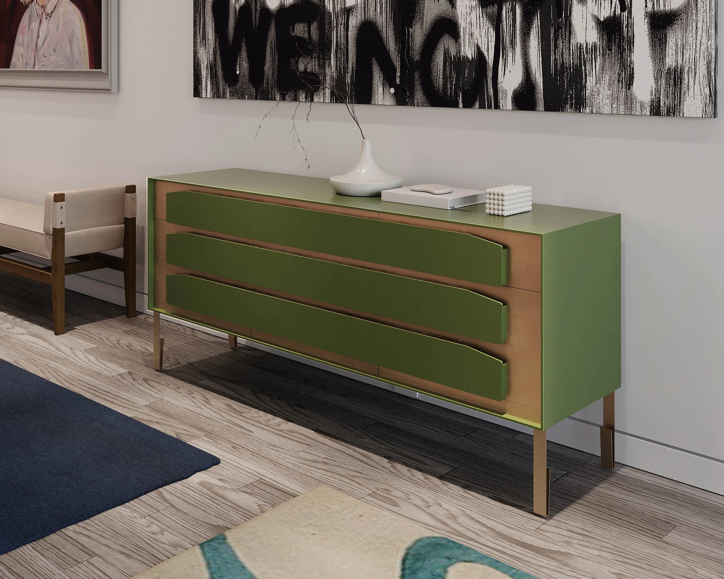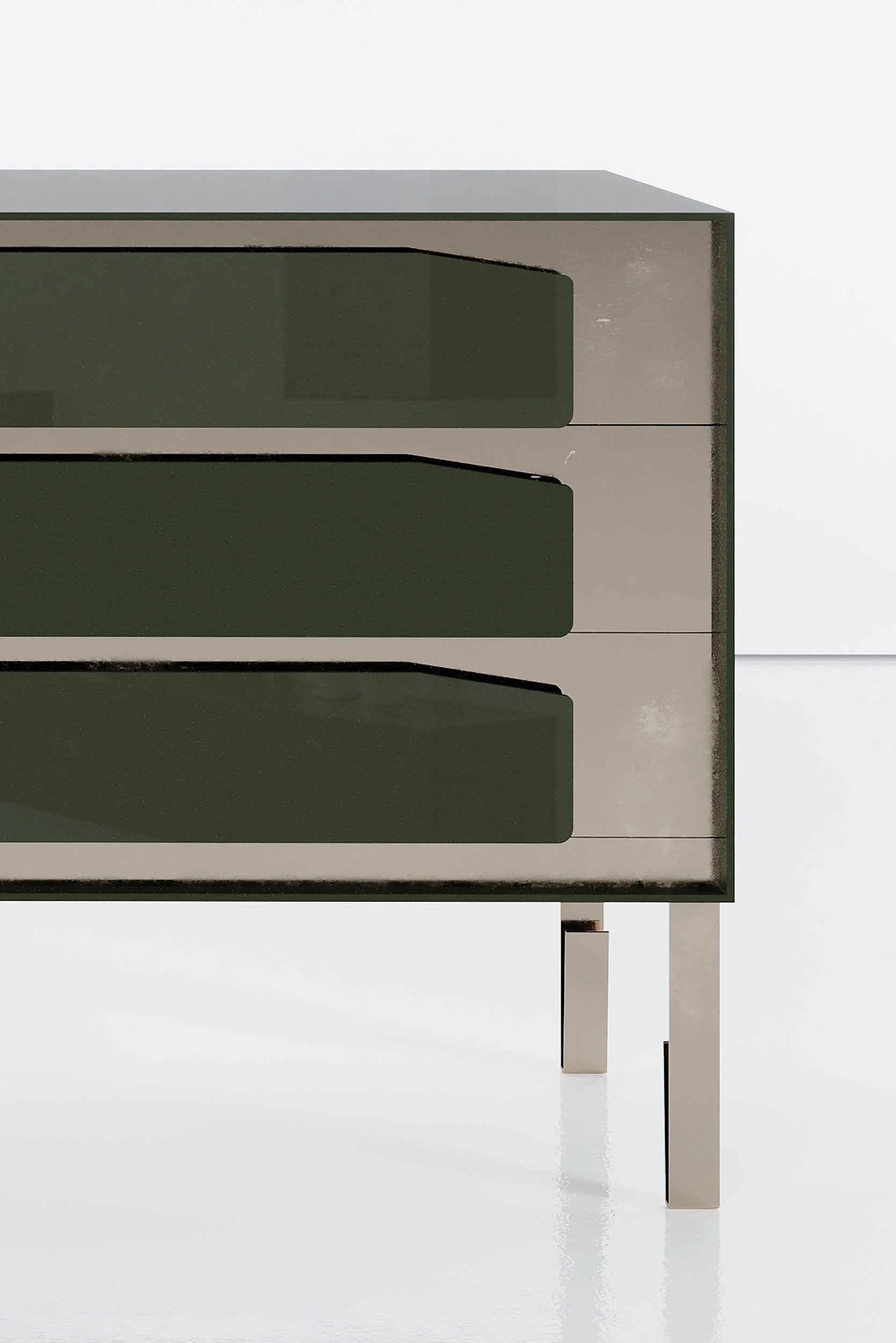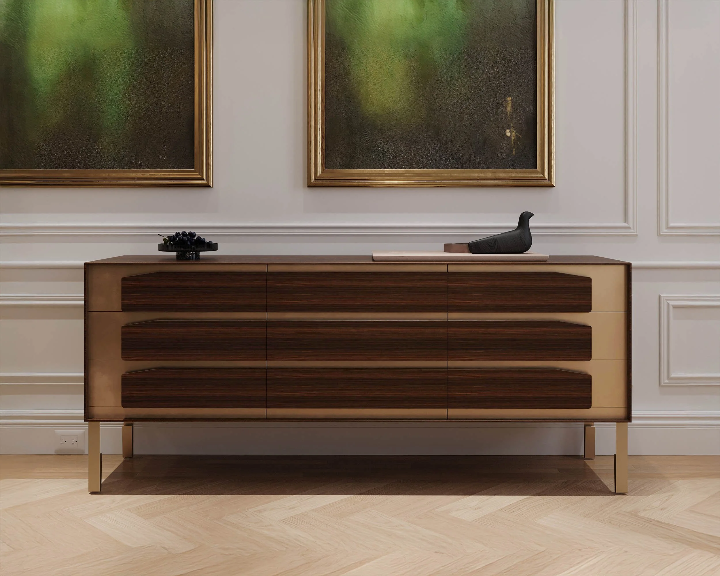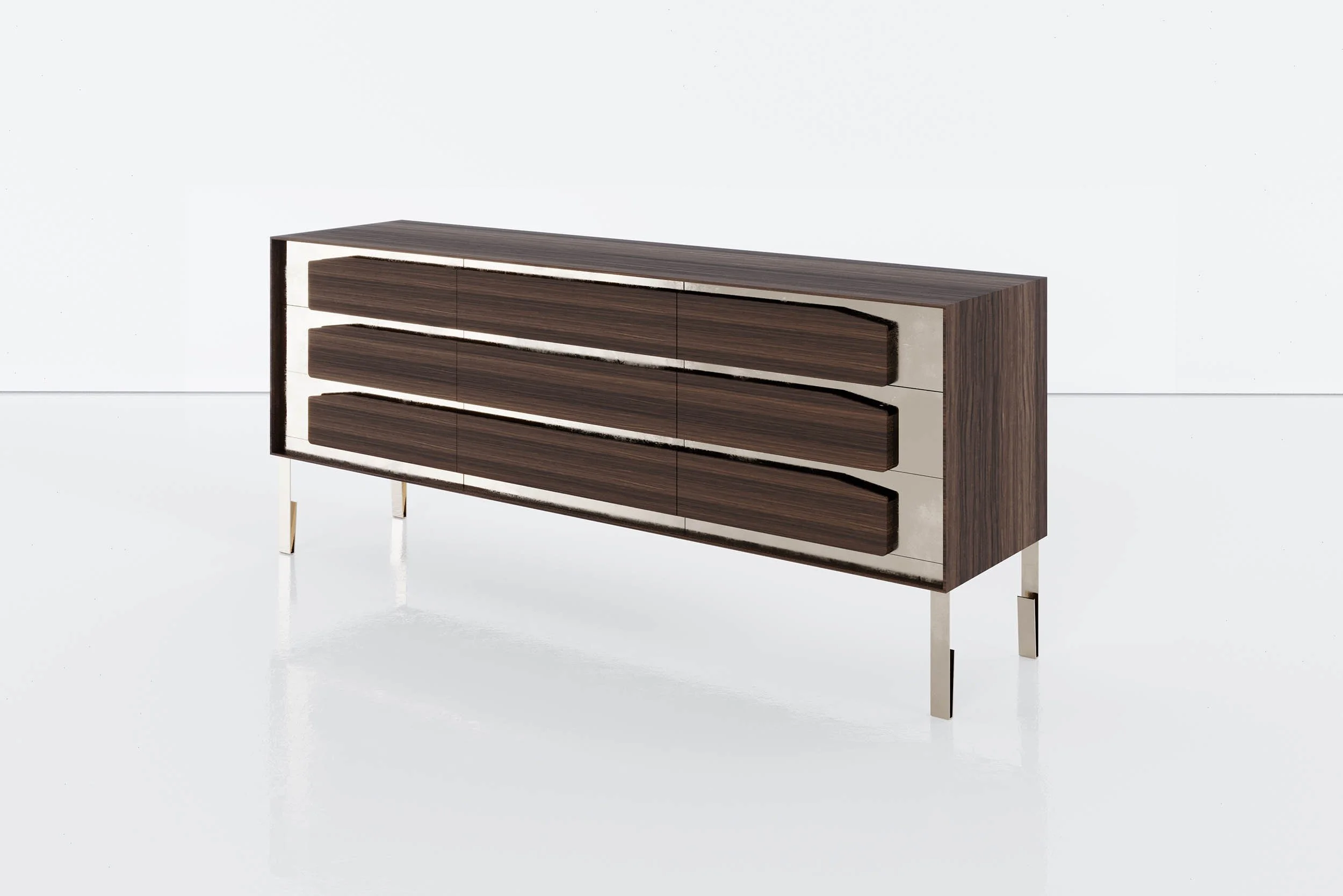 THE PARAISO DRESSER IS A PLAY ON SHADOW AND LIGHT. ITS FLOATING DRAWER FRONTS ARE REFLECTED IN THE POLISHED METAL OF ITS FRAME, WHICH SEAMLESSLY TRANSITIONS FROM A TWO DIMENSIONAL CLADDING TO THREE DIMENSIONAL LEGS.