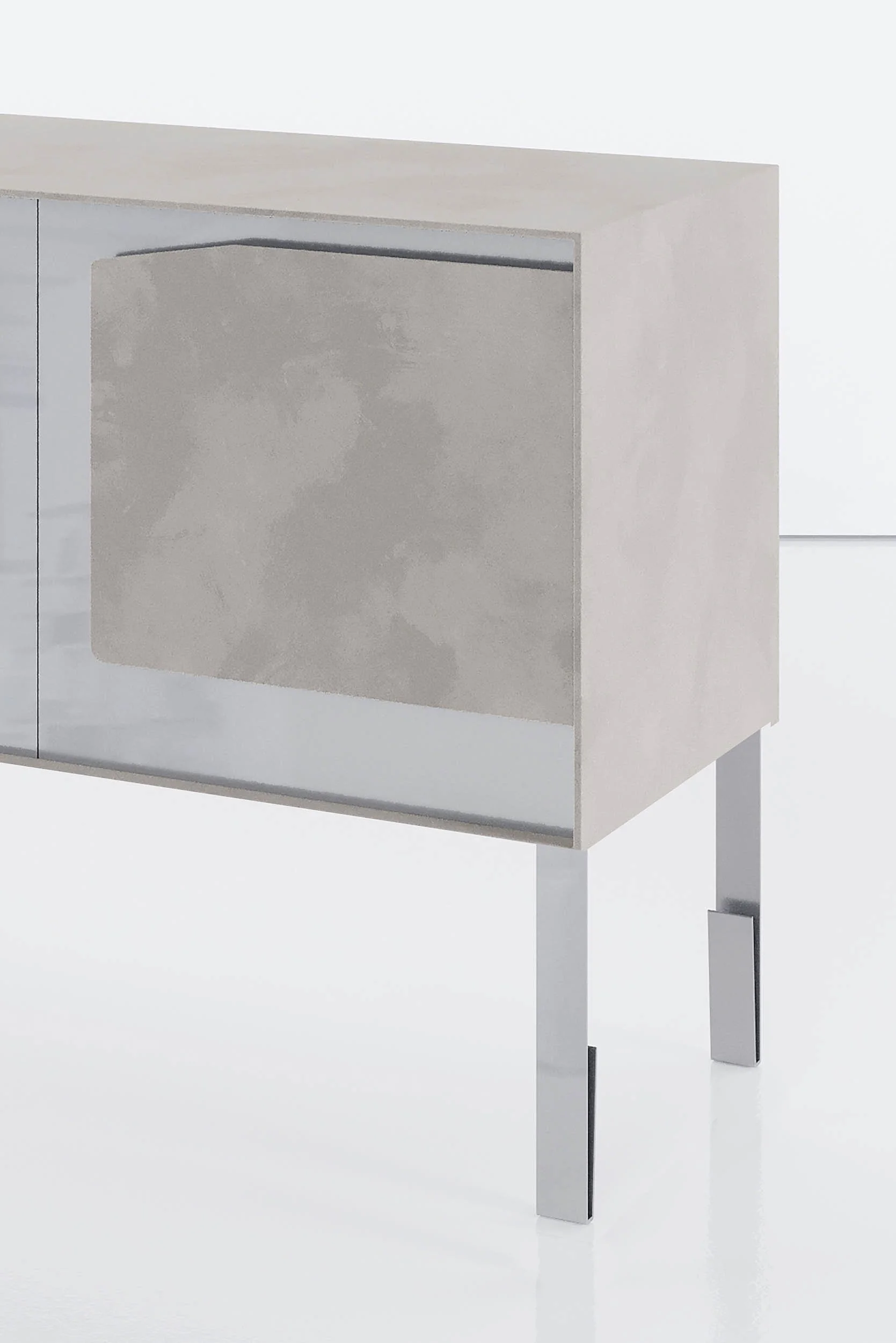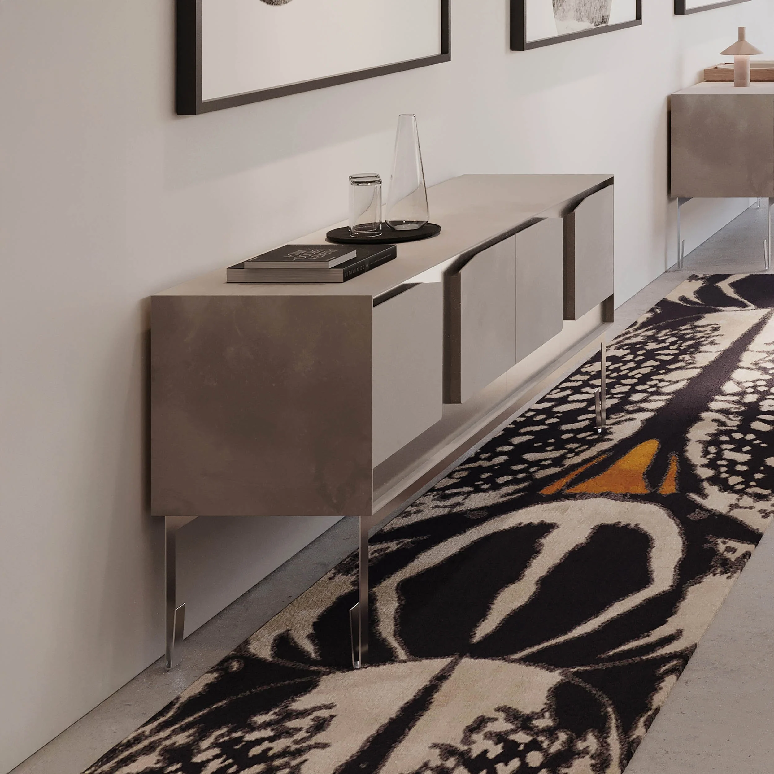 THE PARAISO SIDEBOARD IS A STUDY IN SHADOW AND LIGHT. ITS METAL CLAD FRONT MORPHS SEAMLESSLY INTO LEGS THAT RETURN ON THEMSELVES, MAKING A SEAMLESS TRANSITION FROM TWO DIMENSION CLADDING INTO HAIRPIN LEGS.