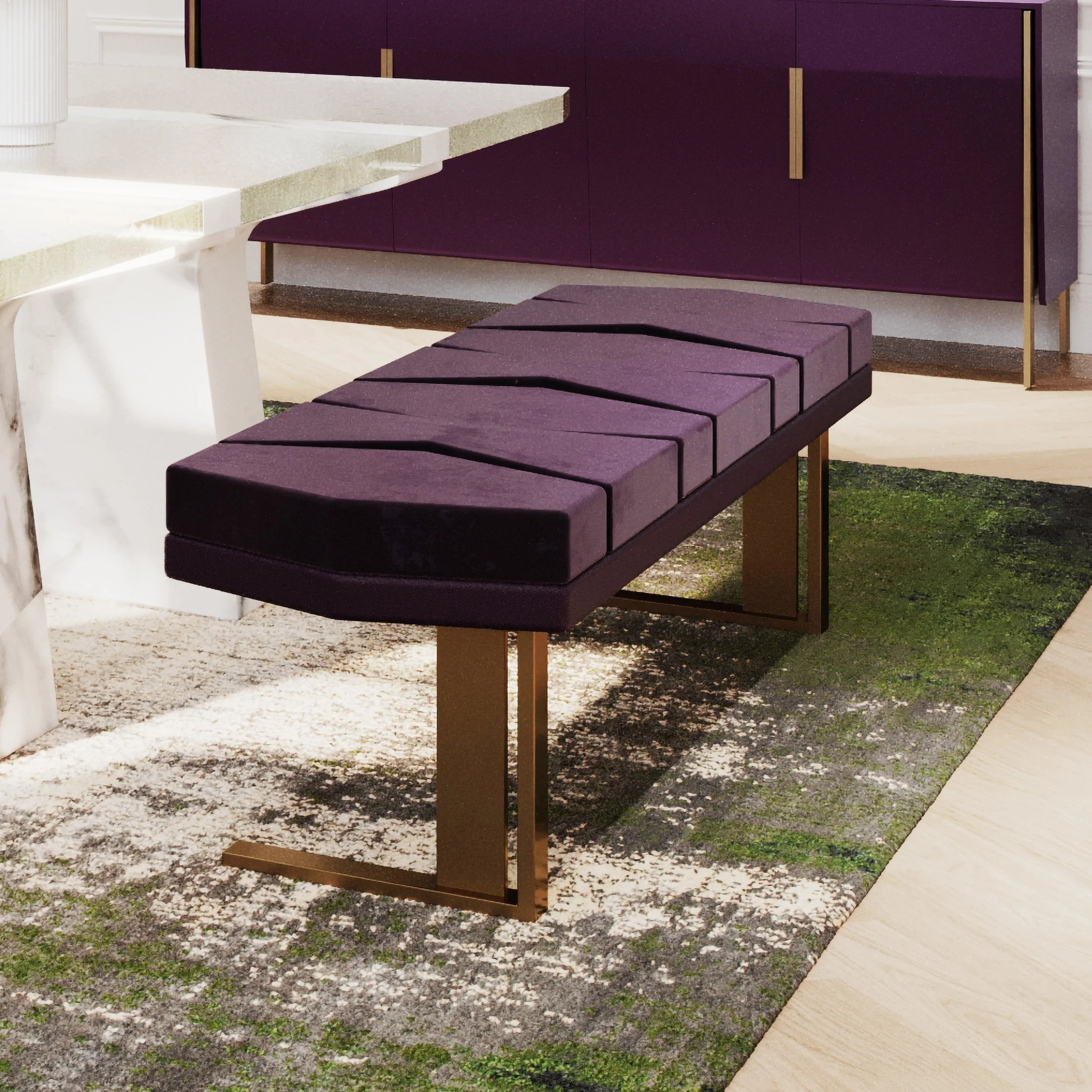 TUFTING AND QUILTING ARE PROCESSES THAT ARE AS OLD AS WEAVING, BUT ONLY IN THE LAST FEW YEARS HAS TECHNOLOGY BEEN ABLE TO EXERT ITS INFLUENCE. THE INTRICATE PATTERN OF DIAMONDS AND HOURGLASS SHAPES ON THE MARIGOT BENCH ARE ONLY MADE POSSIBLE BY INNOVATIONS THAT CAN NOW MARRY UPHOLSTERY TO PATTERNS WE COULD NEVER HAVE ATTEMPTED BEFORE. THE RESULT IS STUNNING, THREE DIMENSIONAL SEATING THAT REINVENTS THE LANGUAGE OF TUFTING. A CANTILEVERED METAL BASE COMPLETES THE DYNAMISM OF THIS PIECE.