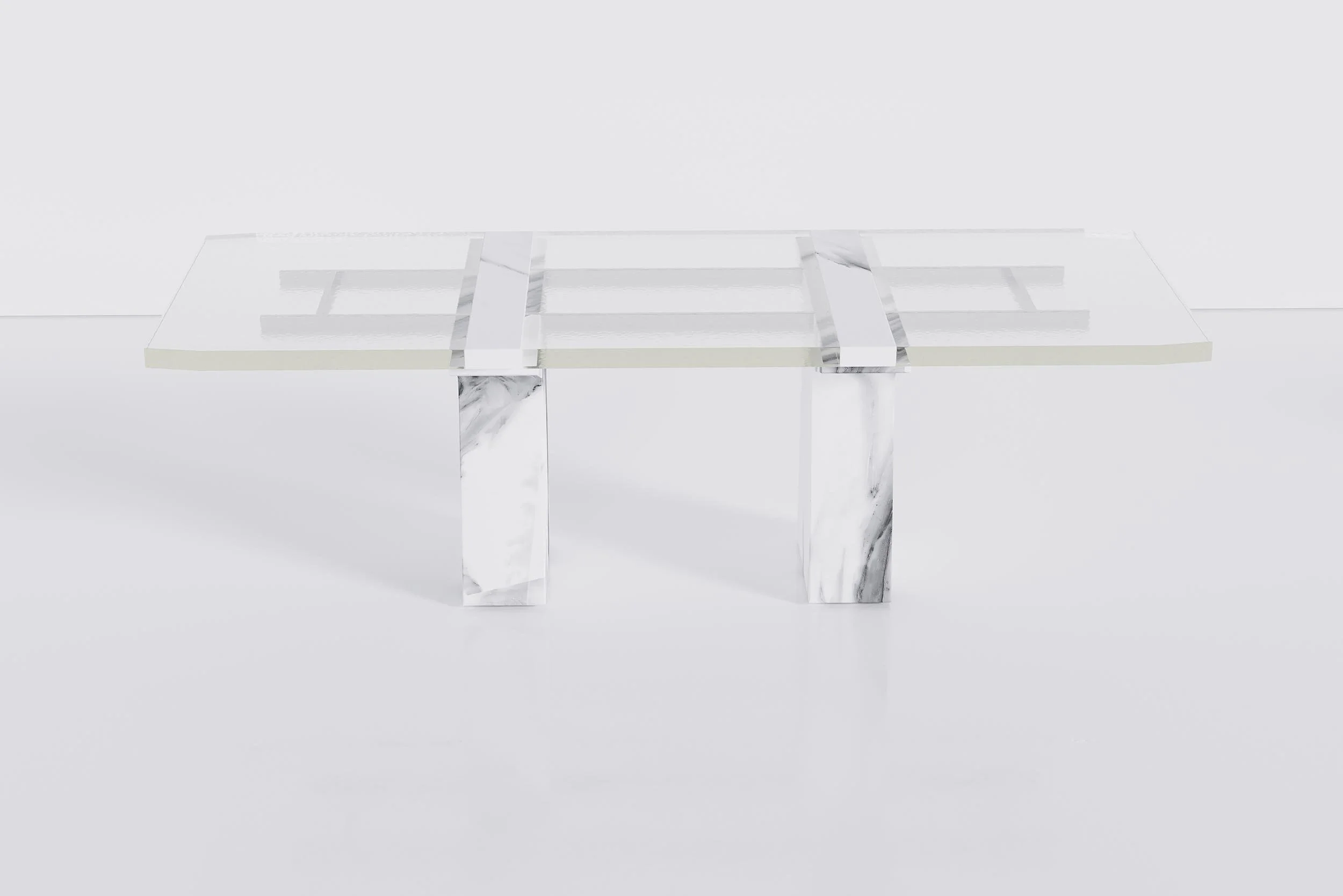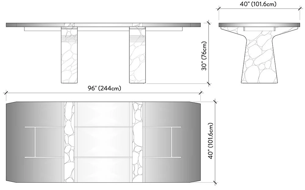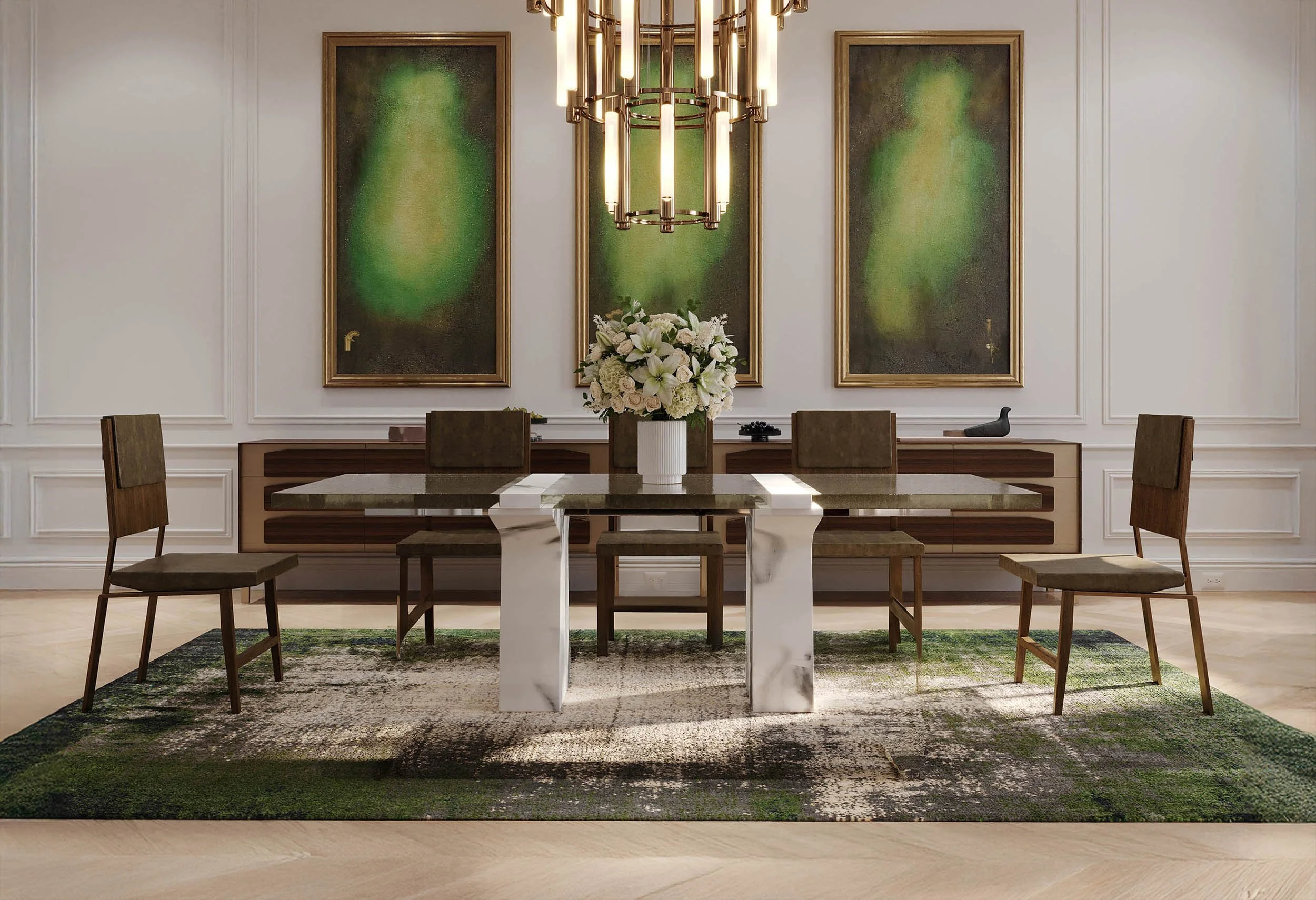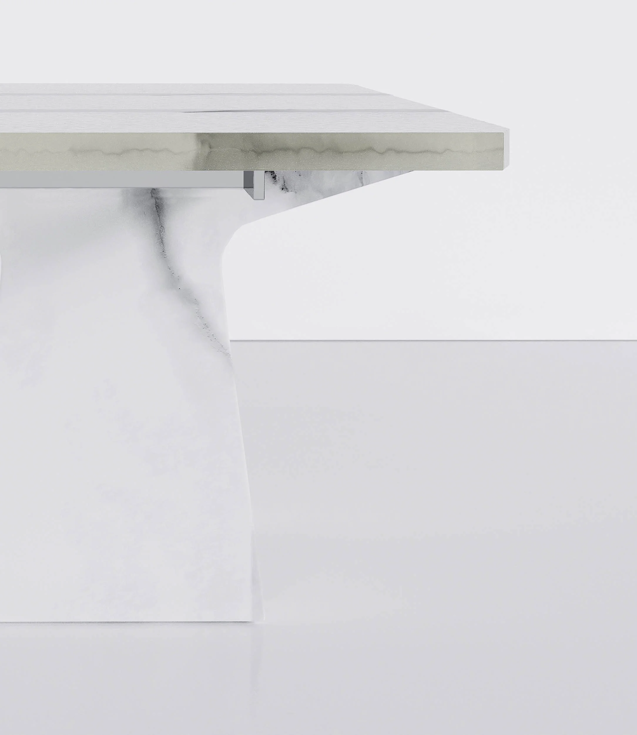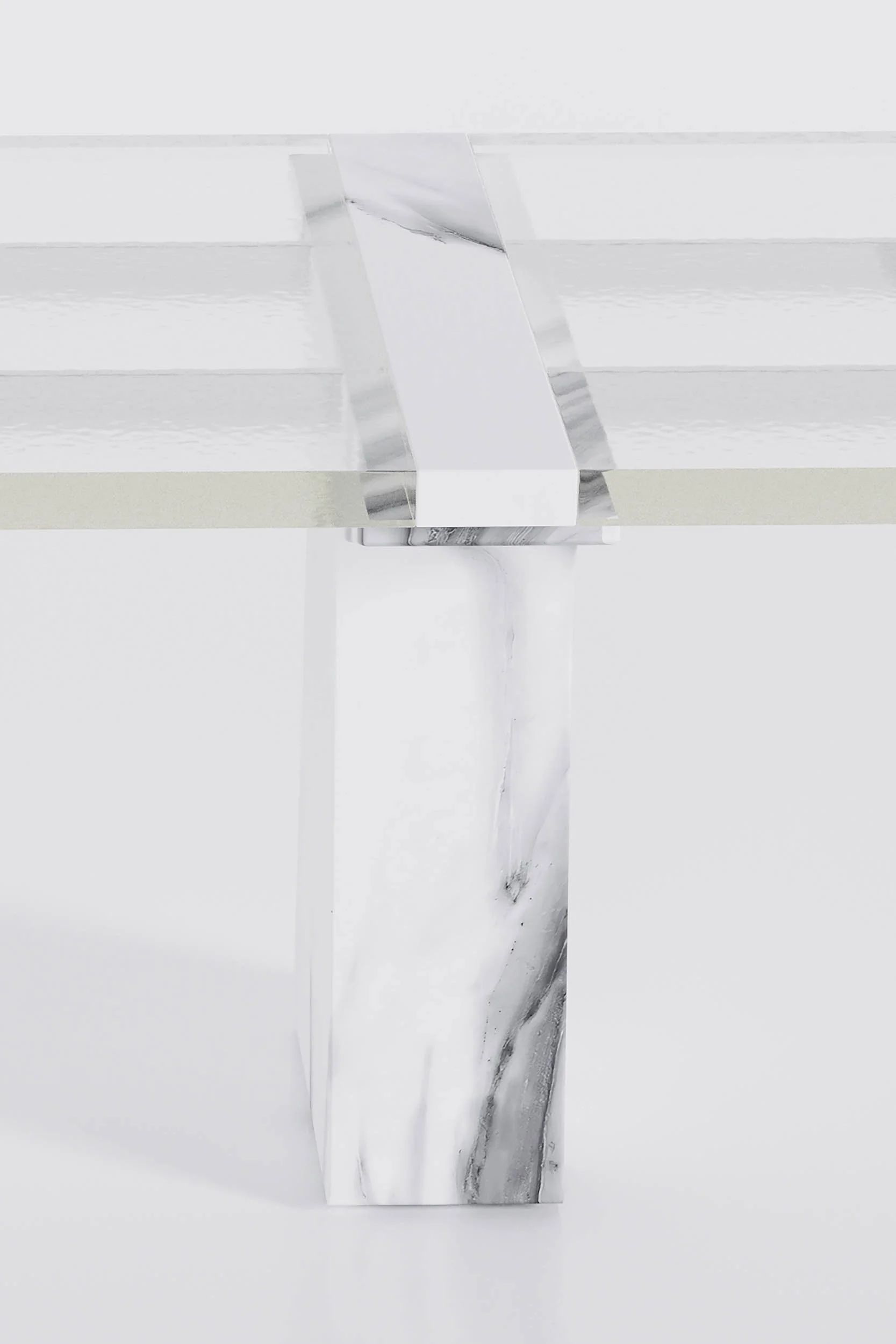 THE CUMBERLAND DINING TABLE IS A MAGNIFICENT COMBINATION OF SOLID, HAND-CARVED MARBLE AND MASSIVELY THICK, QUARTZ CROWN GLASS: A UNIQUELY ORGANIC EXCEPTION TO THE TECTONIC GLASS MATERIAL FOUND EVERYWHERE ELSE. THE TWO MATERIALS ARE MELDED IN A SEAMLESSLY COPLANAR TOP FOR AN INCOMPARABLE DINING OR WORK EXPERIENCE.