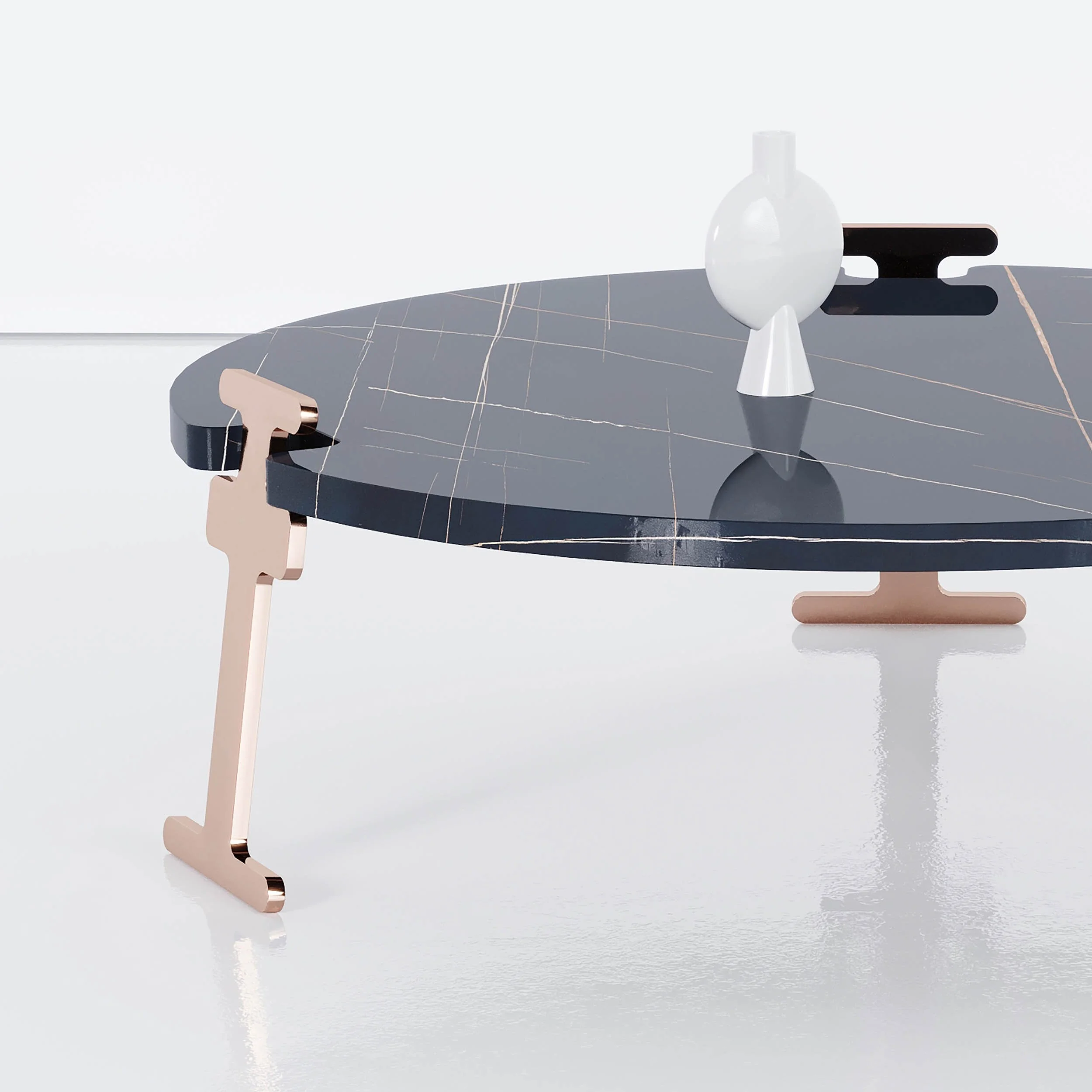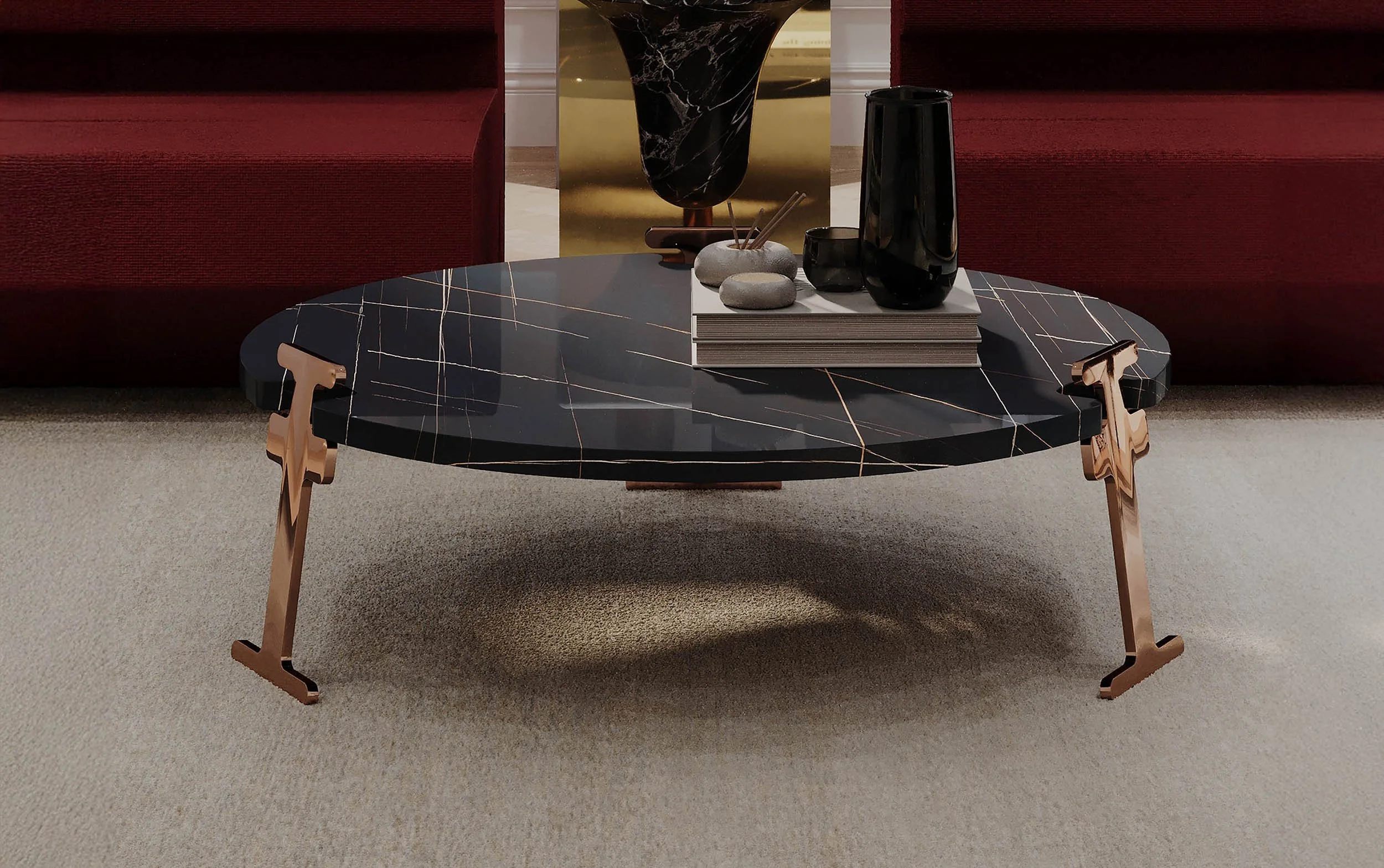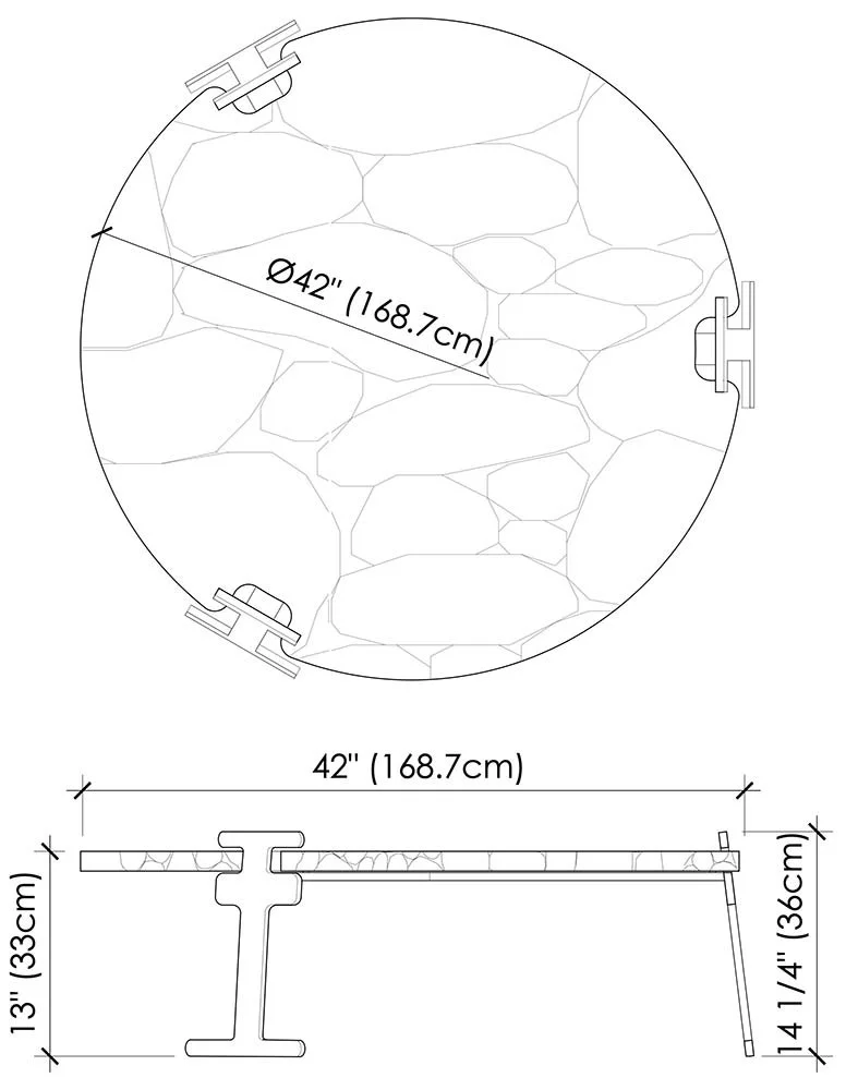 THE GALWAY COFFEE TABLE PAIRS A MONUMENTAL STONE TOP, INGENIOUSLY CUT OUT TO ACCOMMODATE A BASE THAT APPEARS ALMOST AD HOC IN ITS SIMPLICITY. THE RESULTING COMBINATION IS TRULY SPECTACULAR.