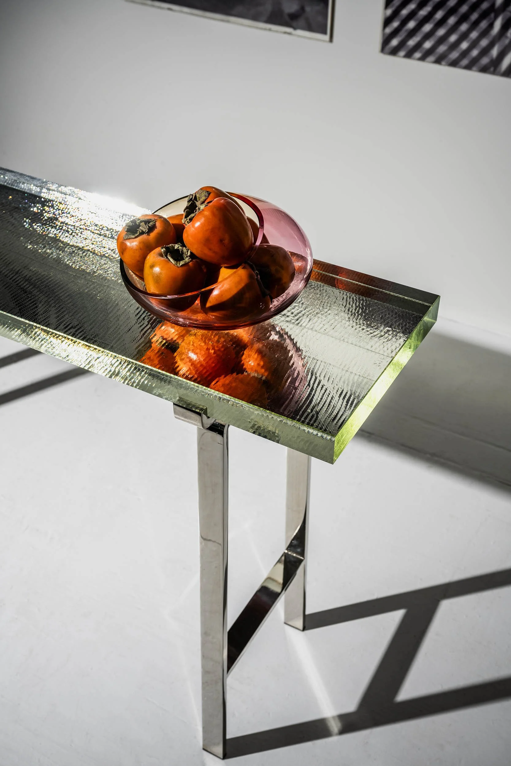 THE VOSTOK CONSOLE IS A SPARKLING JEWEL: THE UNQUESTIONED STAR IN ANY ROOM. ITS MASSIVELY THICK, QUARTZ CROWN GLASS TOP IS TOTALLY SINGULAR AMONG GLASS PRODUCTS. EACH SLAB IS UNIQUE UNTO ITSELF, WITH SWALES, BUBBLES AND AN ORGANIC WARMTH THAT MUST BE EXPERIENCED FIRSTHAND. THE X-SHAPED BASE IS CAREFULLY DESIGNED TO CRADLE THE GLASS IN A WAY THAT IS REMINISCENT OF A JEWEL SETTING. THE VOSTOK IS EQUALLY AT HOME IN BOTH MODERN AND TRADITIONAL SETTINGS.